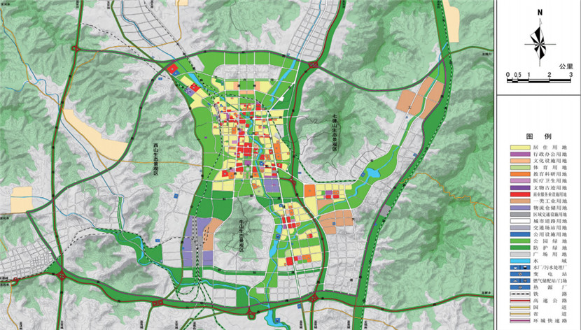 規(guī)劃采取非均衡發(fā)展策略,構(gòu)建圍繞中心城市的“手掌”狀半小時經(jīng)濟(jì)圈,中心城區(qū)為“掌心”,交通軸線為“手指”,沿線城鎮(zhèn)和產(chǎn)業(yè)園區(qū)為“關(guān)節(jié)”,打造 1+5 城鎮(zhèn)與產(chǎn)業(yè)集聚區(qū),提高城市核心競爭力,提升區(qū)域協(xié)作水平,確定了“一城三區(qū)”組團(tuán)空間結(jié)構(gòu),將城市西南片區(qū)及米山片區(qū)納入城市建設(shè)用地范圍,提出了“擁山不占山,營水親近水”的生態(tài)綠地建設(shè)原則,構(gòu)建了“五山相擁、四河相匯”的生態(tài)綠地系統(tǒng),將周邊山體引入城市,將城市河流與大自然相連。